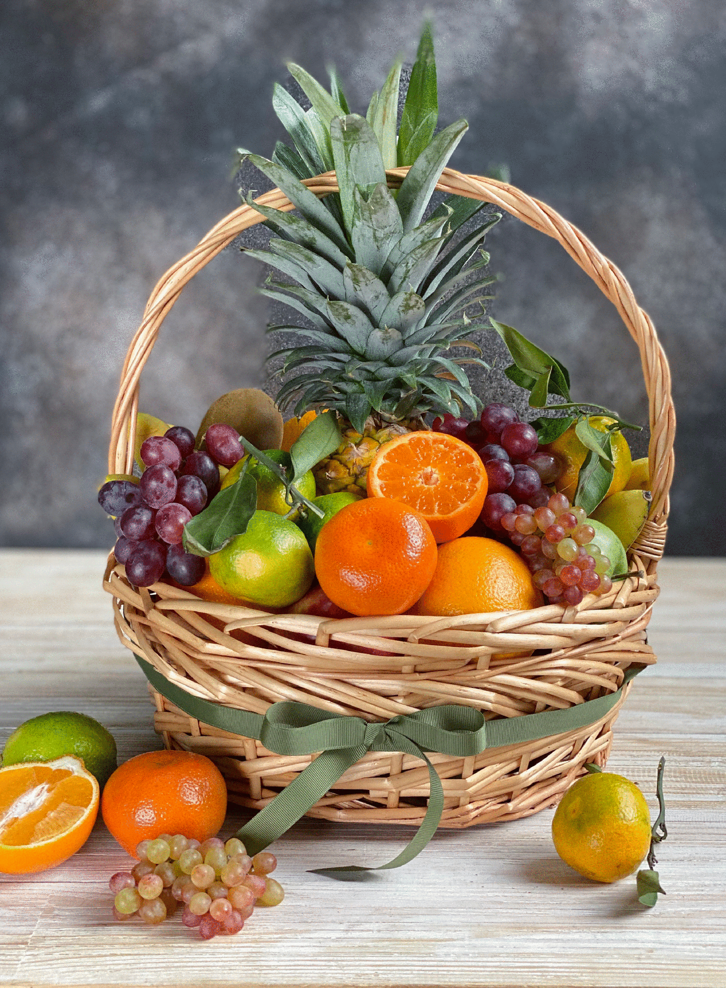 Корзина средняя, ананас, апельсины, мандарины, грейпфрут, лайм, лимоны, киви, яблоки, груши, мини бананы, 2 вида винограда. Возможно изменение состава в зависимости от поставок, сезонности фруктов и ягод. 5 кг.